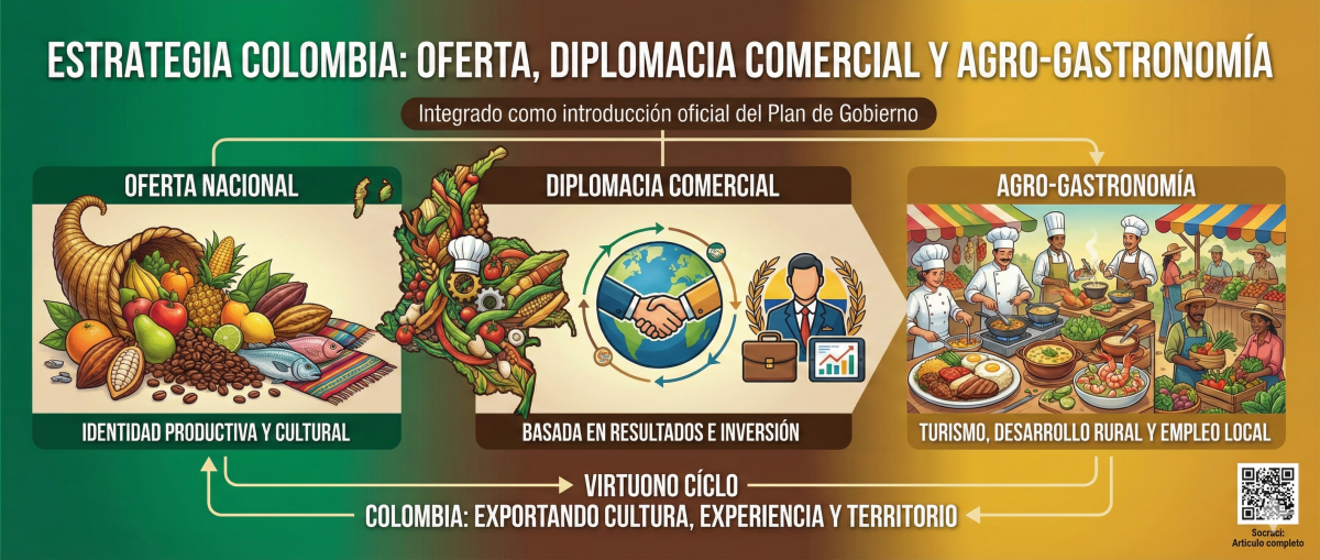 Colombia debe integrar su política exterior, su gastronomía y su desarrollo rural en un solo sistema económico donde los embajadores actúen como gestores comerciales medidos por turismo gastronómico, compras internacionales e inversión extranjera, mientras el turismo impulsa directamente la demanda de productos locales, fortaleciendo a los campesinos con mejores precios y menos intermediación; así, los jóvenes encuentran oportunidades como agroemprendedores y las regiones desarrollan clústeres productivos según su vocación, creando un círculo virtuoso en el que el país exporta cultura, experiencia e identidad, al tiempo que dinamiza su economía interna y reduce desigualdades.