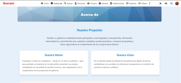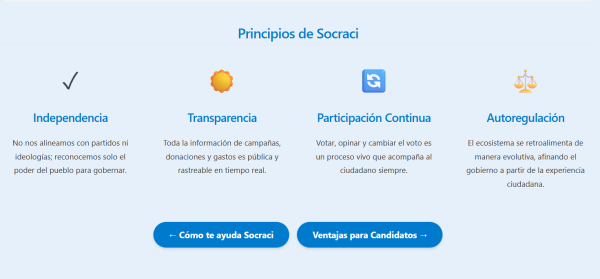 CONOCE LOS BENEFICIOS DE LA PLATAFORMA SOCRACI. PARA UNA DEMOCRACIAS TRANSPARENTE Y PARTICIPATIVA, IMPULSA TU PRAGRAMA DE GOBIERNO Y COMPARTE CON TUS SEGUIDORES DE LAS REDES SOCIALES. EMPDERATE Y APORTA PARA EL FUTURO DE TU LOCALIDAD Y REGION. ELECCIONES 2026